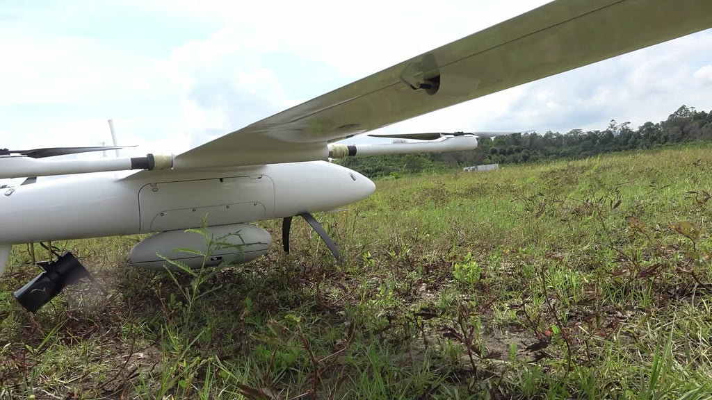 The Sky Whale heavy-lift electric VTOL drone was specially developed for LiDAR mapping, long-distance cargo delivery and transport, and security and surveillance. It comes with four lift motors and one fixed-wing motor, which allows the fixed-wing VTOL to ascend like a quadcopter. Once in the air, the aircraft transitions to horizontal flight as a push-prop fixed-wing.